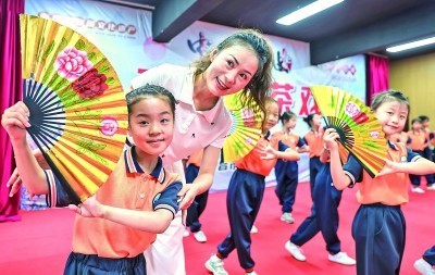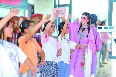 在山东省青岛市李沧区文化馆,大学生志愿者指导孩子熟习京剧基本动作。张鹰摄/光明图片