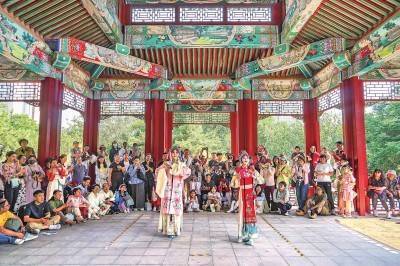 昆曲演员在天津中华剧院园林中上演昆剧《牡丹亭》。金立冬摄/光明图片